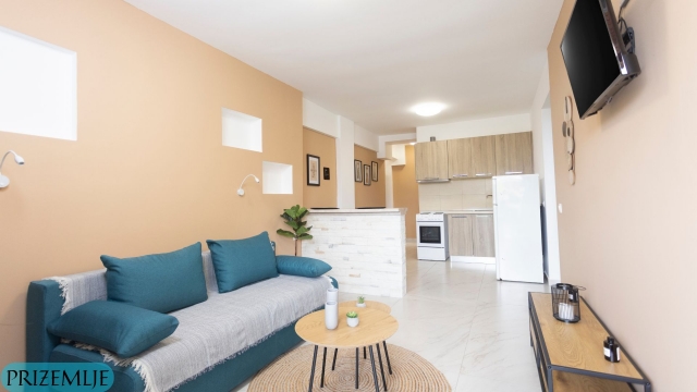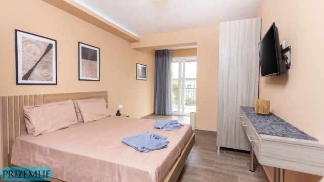 Smeštaj: Svaka smeštajna jedinica ima opremljenu kuhinju sa elementima i posuđem za osnovno pripremanje i konzumiranje hrane za predviđeni broj osoba, kupatilo sa TWC-om, terasu, TV, i klima uređaj.